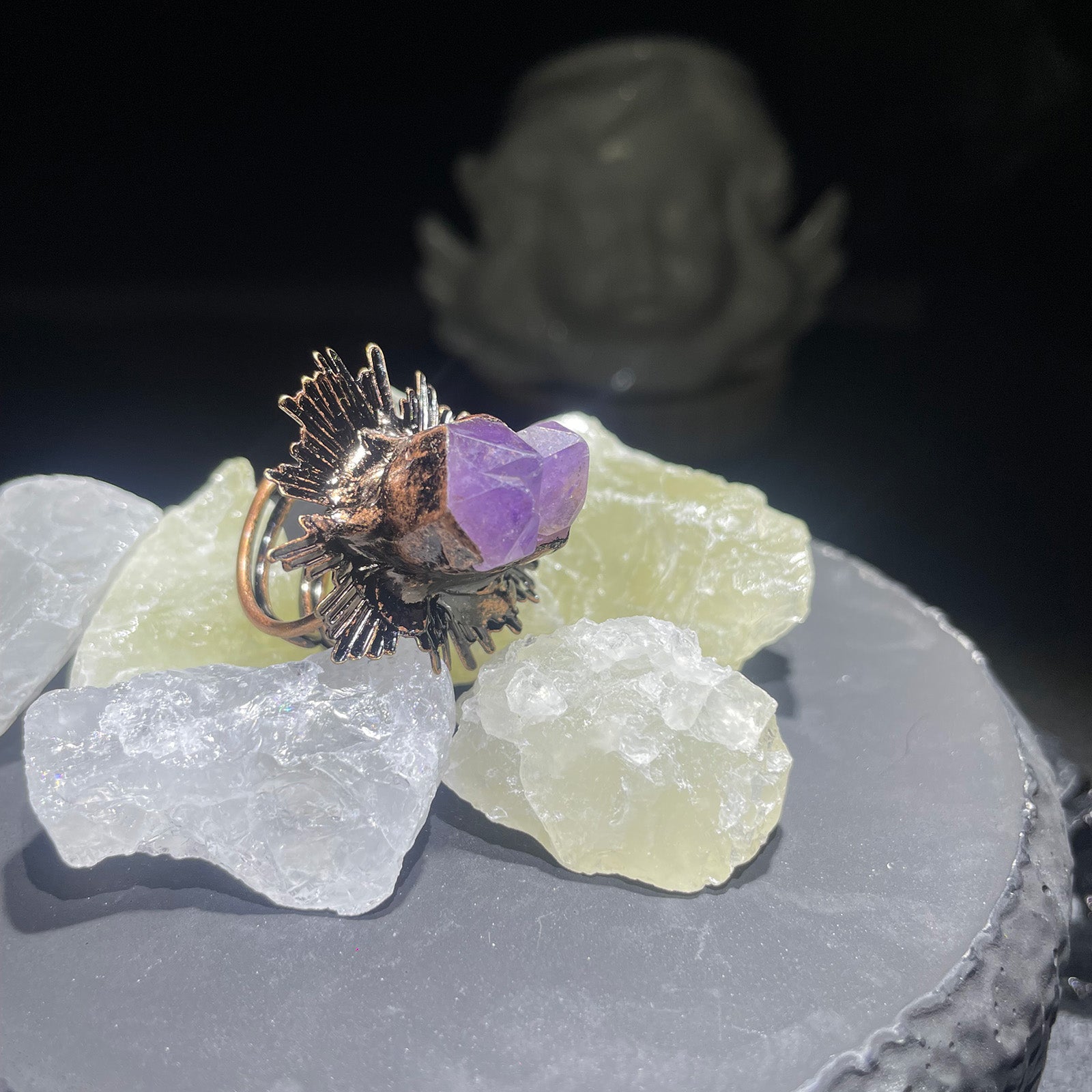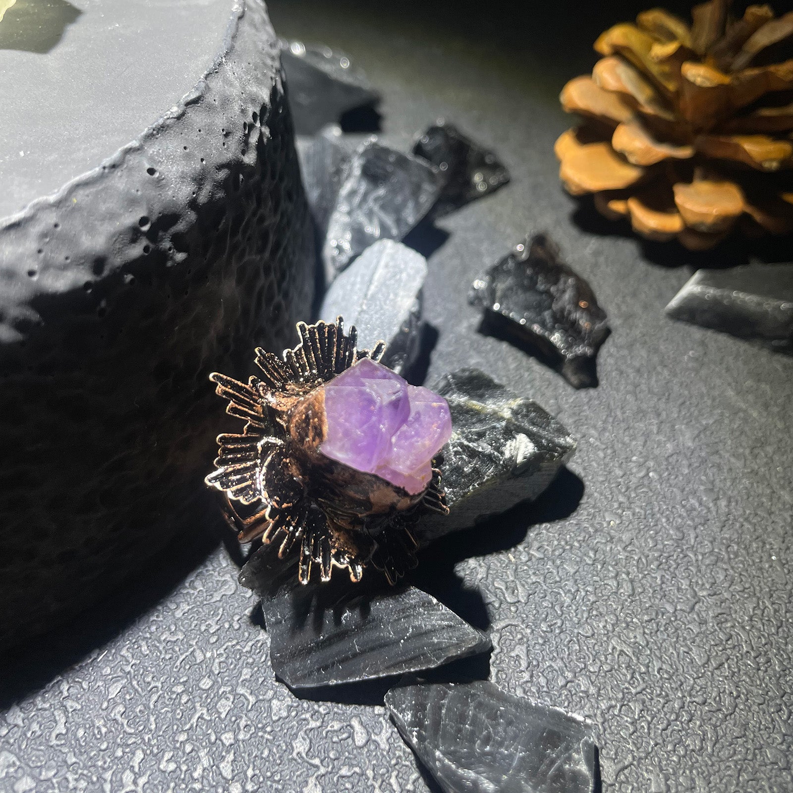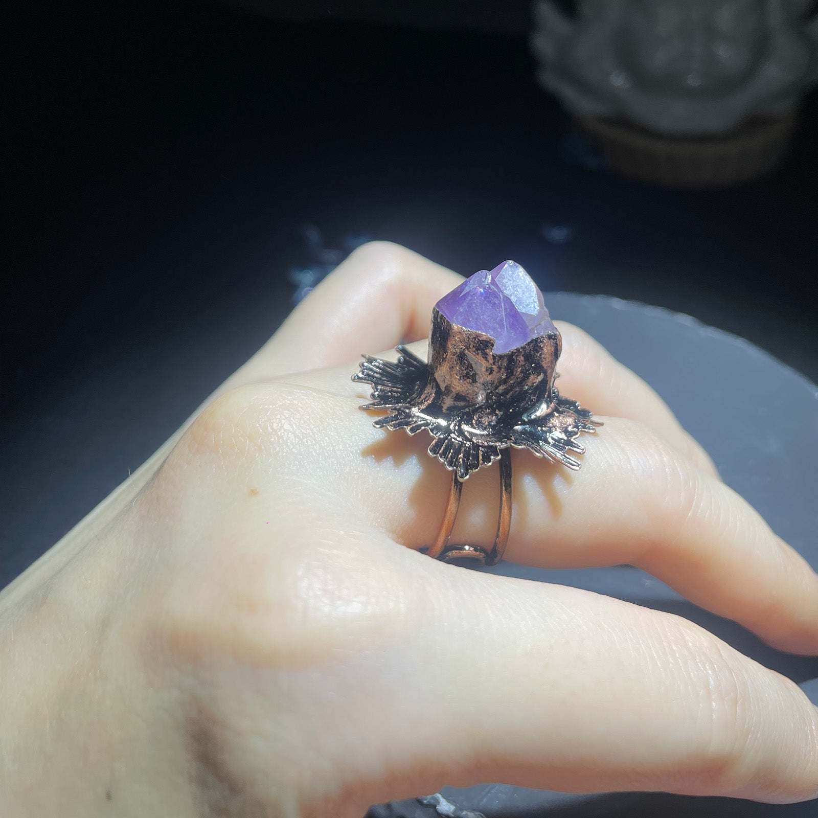 This one-of-a-kind ring features a natural raw amethyst crystal, carefully set in an antique copper solder design. Each piece is handcrafted, embracing the organic shape and natural beauty of the stone—no two rings are ever the same.